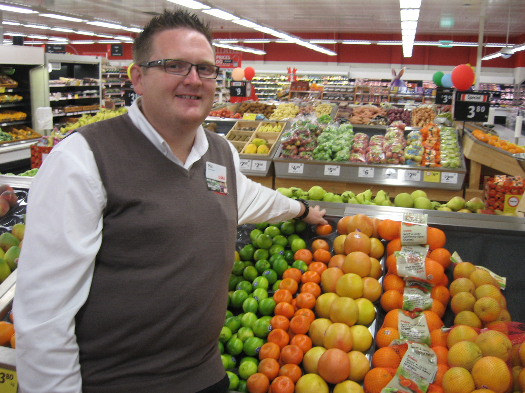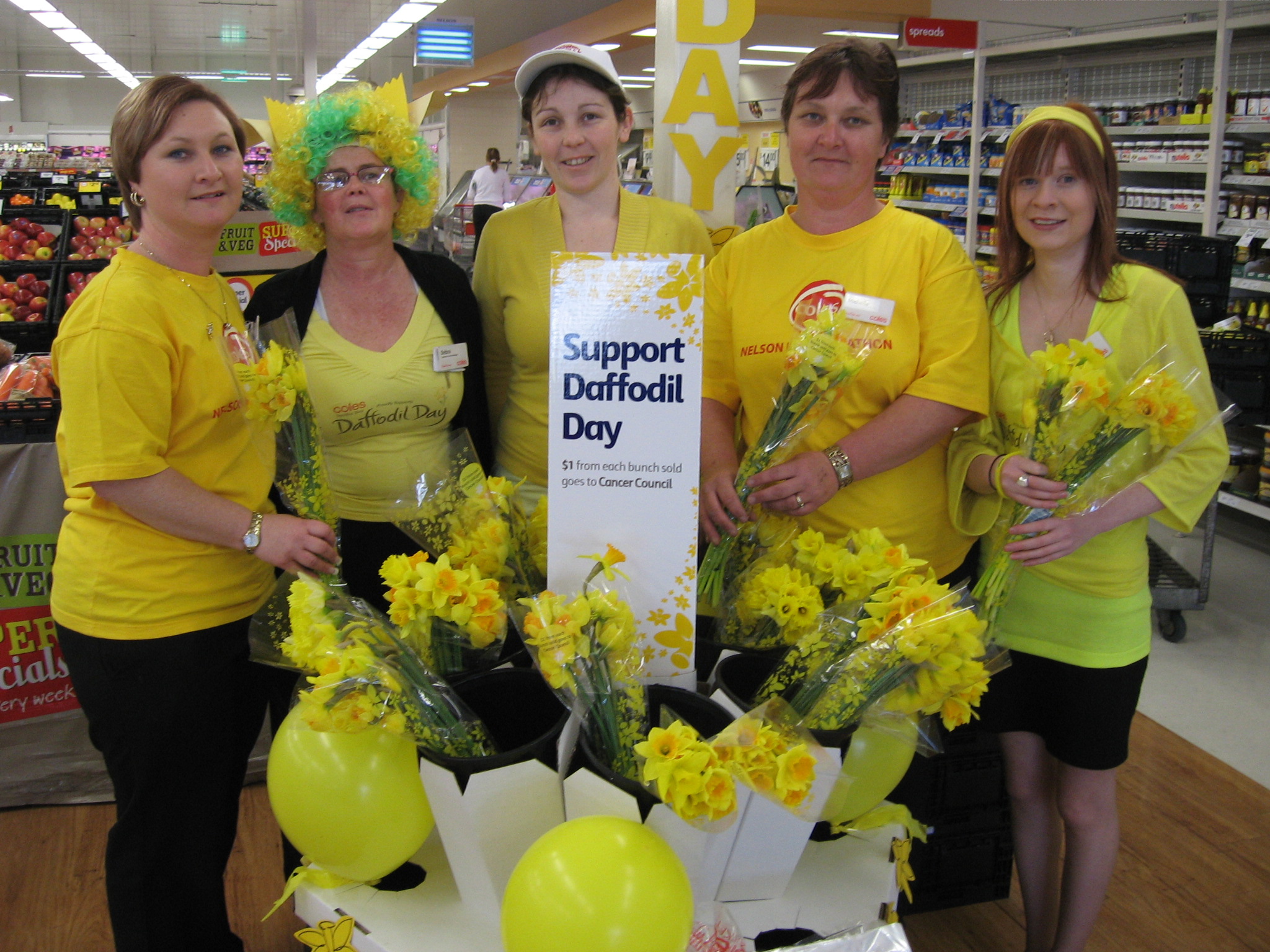 File photo: Coles staff on 'Daffodil Day' Tanilba Bay and a manager inspects the fruit and vegetable produce.