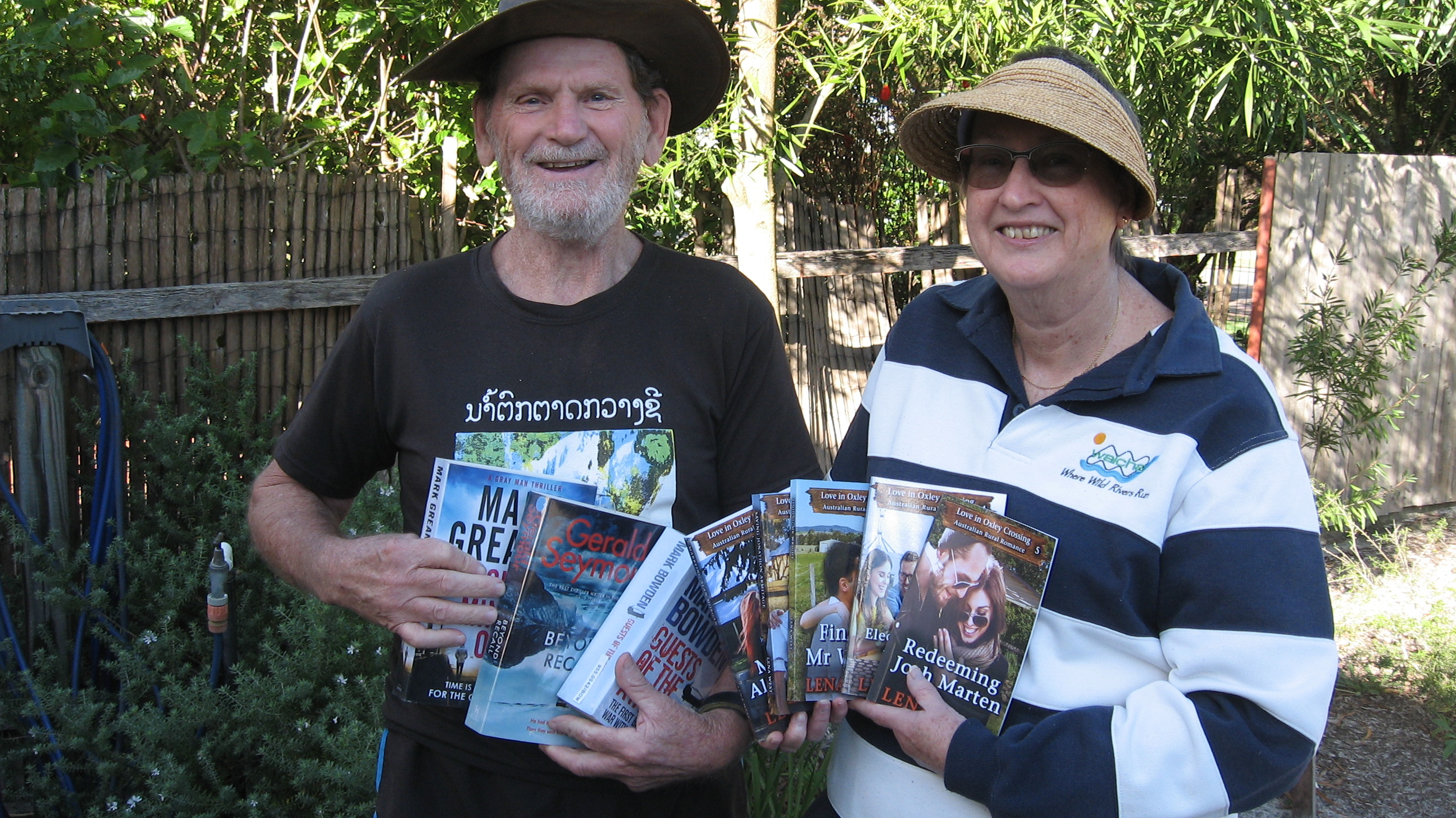 Photos: Darryl and Helen between trips and sharing their mutual passion for books.